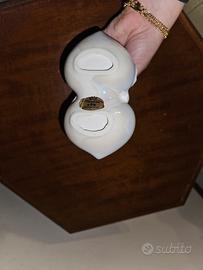 soprammobile, mini svuotatutto in porcellana bianca perlata a forma di 2 cigni che si abbracciano, con dettagli dorati, nuovo.