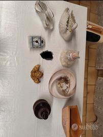 Bellissimi soprammobili decorativi per la casa. Vendita anche singolarmente - Cigno in porcellana bianca. - Statuetta di un clown in porcellana. - Oggetto decorativo a forma di conchiglia con dettagli dorati. - Piccolo portariviste in legno decorato con fiori. - Base in legno scuro. - Orologio da tavolo con cornice decorata. - Oggetto decorativo in metallo. - Portacenere in ceramica bianca e oro.