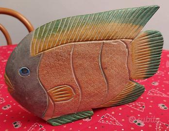 Soprammobili Gatto e Pesce in legno pitturati a mano anni 70 TENUTI BENISSIMO Soprammobili Gatto e Pesce in legno pitturati a mano anni 70 Dimensione gatto: 11 x 8 x h23 cm Dimensione pesce: 25 x 5 h17cm Venduti in coppia
