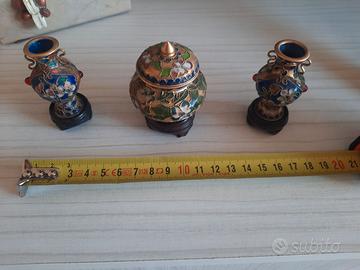 Tris di soprammobili in metallo smaltato, 2 anfore e una giara, tutti con base di sostegno. Decorazioni floreali in risalto. Altezza 7 cm circa