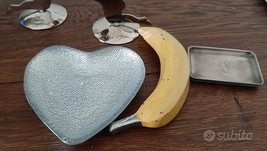 Soprammobili vari: - 2 portacandele stilizzati con angeli in metallo - 1 scatolina gialla in legno - Una ciotola a forma di cuore in metallo martellato. - Una ciotola quadrata in vetro con decoro a tulipano in argento. - Una piccola bomboniera rettangolare in metallo (disponibili 3) - 1 banana in metallo PREZZI SINGOLI DA CONCORDARE