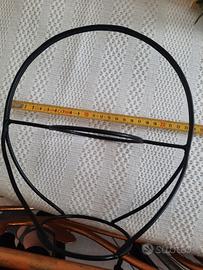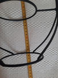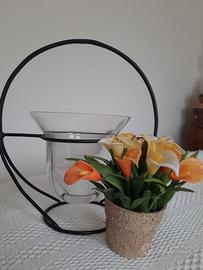 Vasetto di vetro su supporto in ferro di colore nero. Nel bicchiere di vetro c’è un vasetto di piccole calle bianche, gialle e arancione, finte ma molto carine. Misure cm 28 di altezza e cm 25 di larghezza.