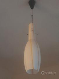 Rara Sospensione Vistosi "Serie Birillo" – Design Alessandro Pianon – Murano anni '60 Incredibile pezzo di storia del design italiano: lampada a sospensione in vetro di Murano prodotta da Vistosi negli anni '60, su disegno originale di Alessandro Pianon. Questa lampada fa parte della celebre serie caratterizzata dalla forma a ogiva (o "a birillo"), un'icona del gusto Mid-Century Modern e Space Age. Dettagli Tecnici: Lavorazione: Vetro incamiciato soffiato a bocca con decorazione a canne verticali policrome (toni caldi dell'ambra, ocra e terra) su base bianco lattimo. La luce, filtrando attraverso le canne, crea un'atmosfera calda e scultorea. Periodo: Circa 1960/1970. Materiali: Vetro di Murano di altissima qualità, montatura originale in metallo con finitura brunita. Condizioni: Eccellenti. Il vetro non presenta sbeccature, crepe o graffi superficiali. Il cablaggio è originale e funzionante (se ne consiglia comunque la revisione tecnica per pura conformità di sicurezza). Perché acquistarla: Non è solo un corpo illuminante, ma un investimento. Il design di Alessandro Pianon per Vistosi è costantemente presente nelle più importanti aste internazionali di design d'autore. La combinazione di colori e la forma slanciata la rendono perfetta per un salotto di rappresentanza o sopra un tavolo da pranzo moderno.