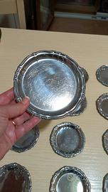 Bellissimo set vintage in acciaio composto da sotto bottiglia e da 12 sotto bicchieri. Il set ha un gusto del passato con le sue decorazioni tipiche. È un set che va sempre di modo e arricchisce sempre la tavola soprattutto nelle occasioni particolare. Condizioni ottime, segni d'usura del tempo