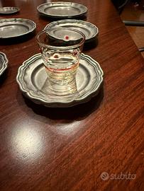 Set composto da 12 sottobicchieri in peltro di dimensione media, 1 piccolo e 2 sottobottiglie. Vintage risalente agli anni ‘60/‘70. Ottime condizioni.