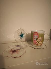 Set di 4 sottobicchieri in resina fatti a mano. Motivo floreale, con glitter. Possibilità di personalizzazione in differenti tonalità di colore.
