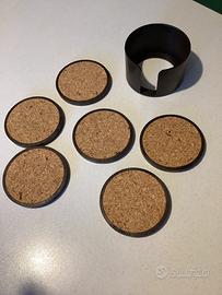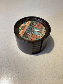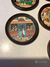 Set di Sottobicchieri in sughero con bordo in plastica, illustrazioni di Bin Kashiwa. Scene negozianti parigini. Diametro cm 10 ottime condizioni ottime solo piccolissima sbeccatura sul porta bicchieri ,( vedi ultima foto)