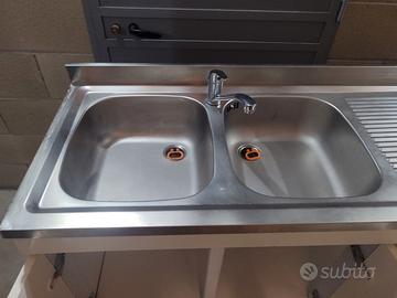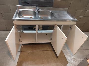 Mobile sottolavello con doppia vasca acciaio in buono stato, munito di scarico, rubinetto, tubi flessibili, dim. 120 x 50 x 84 cm altezza, prezzo 90 euro, piedi regolabili, piano terra, zona corso Venezia Torino Nord, possibilità di trasporto.