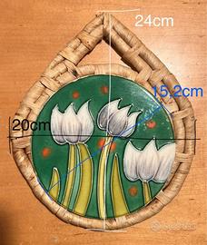 Sottopentola in Ceramica dipinta con motivi floreali a colori e il basamento in Vimini.