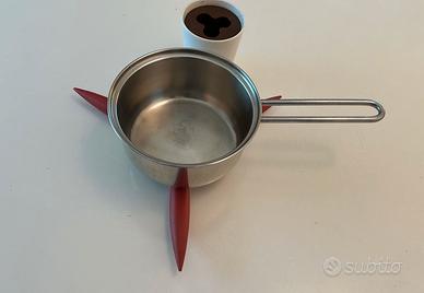 È composto da due elementi: un vaso di porcellana bianca e il sottopentola vero e proprio, che quando non si usa si può chiudere e riporre nel suo vasetto dove prende la forma di una piantina stilizzata.