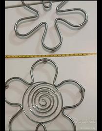 Due sottopentola a forma di fiore, in acciaio. Sono in buone condizioni, uno presenta una spirale al centro. - Perfetti per proteggere i tavoli dal calore. - Misurano circa 18 cm di diametro.