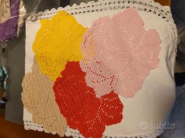 Sette sottopiatti realizzati all'uncinetto in cotone di diversi colori a forma di rosa. Sei misurano 20x 24 cm; 1 misura 24 x 27 cm