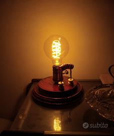 Base in castagno massello ricavata a fresa da unica tavola di 5 cm di spessore, impregnata e laccata ad acrilico trasparente. Portalampada in ottone con interruttore rotativo laterale. Cavo in treccia marrone 1,5 metri.