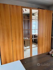Vendo ampio e robusto armadio guardaroba a 6 ante, perfetto per ottimizzare lo spazio in camera da letto, in un corridoio capiente o in uno spogliatoio. La sua elegante finitura effetto ciliegio e le due ante centrali a specchio lo rendono un elemento funzionale e di design, capace di illuminare e ingrandire visivamente l'ambiente.