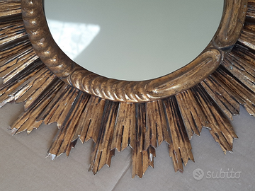 Specchio solare a forma di sole in legno dorato di fattura artigianale anni '70.