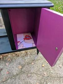 specchiera anni 50 / 60 come da foto dipinta di nero, interno del cassetto fucsia. Misure: H173, L100, P33 Largh.max specchio 60 Cassetto : L40 H64 Piedi: 19