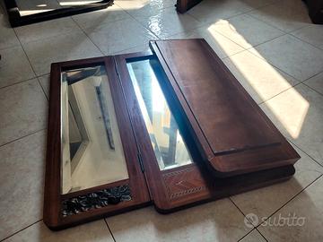 Specchiera toilette con i due specchi laterali pieghevoli. Intarsi di rose in ottone.Molto pesante.Qualche macchia scura nello specchio, cornice in legno in buono stato. Qualche scheggiatura.Solo ritiro.