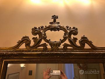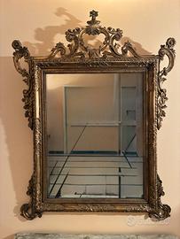 Antica specchiera dorata Luigi Filippo proveniente da una villa nel bergamasco. Ha bellissimi intagli nella cimasa, sui lati e nella parte inferiore. Risalente alla prima metà dell’800, non necessita di alcun intervento di restauro ed è pronta da appendere.