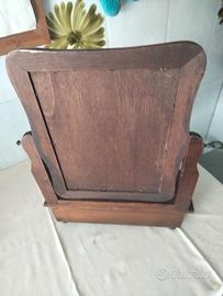 La specchiera da tavolo in arte povera è una riproduzione moderna delle specchiere che usavano una volta le nostre nonne quando erano giovani.Da poggiare sul comò oppure su un tavolo al suo interno conteneva una scrigno per riporre gli oggetti preziosi per abbellirsi oppure le spazzole e ci accessori per l'acconciatura.Realizzato in legno di noce,lo specchio è regolabile in inclinazione.DIMENSIONI:altezza 44 cm,larghezza massima 34 cm,profondità 16 cm.