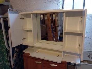 specchiera bagno composta da specchio centrale, ai lati due comparti e un terzo scomparto sotto poi due mensoline. ampia e comoda