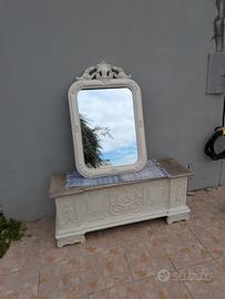 Vendesi splendida specchiera antica in stile Barocco, finemente restaurata a mano con tecnica Shabby Chic. La cornice presenta ricchi intagli ornamentali e una cimasa (parte superiore) decorata con motivi a conchiglia e volute classiche. Finitura: Colore verde salvia chiaro con effetto decapato che ne esalta i volumi e i dettagli artigianali. Versatilità: Ideale da appendere sopra un camino, una consolle all'ingresso o in camera da letto. Stato: Vetro originale in ottime condizioni e cornice solida. Nota: L'annuncio si riferisce esclusivamente allo specchio (parte superiore visibile in foto). Un pezzo di grande carattere che dona luce e uno stile provenzale raffinato a qualsiasi ambiente