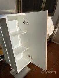 Vendo specchiera con mobiletto laterale e mensolina per bagno Condizioni buone Il mobiletto era bianco ma il rivestimento si é staccato Il legno é buono Ha anche la luce 85x113x20