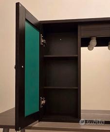 Specchiera artigianale in legno massello wengè nero con sportelli laterali contenitori con vetri fumè e luce a led. Misure 100 x 70 cm In perfetto stato, vendo per trasloco.