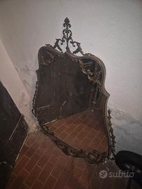Vendo splendido specchio d'epoca in stile Rococò (Luigi XV), caratterizzato da una ricca cornice in ottone finemente lavorata con motivi a volute e copete decorativo.