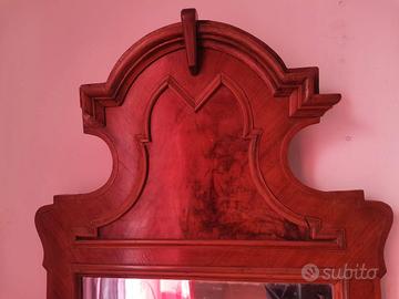 Specchiera da appoggio in legno come da foto per amatore. Alcuni piccole parti in legno si sono staccati sono da reincollare. Comprata da antiquario negli anni 80. Misure: Altezza 112cm, larghezza base 104cm larghezza specchio 62 cm. Disponibile per il ritiro in zona San Donato Bologna.