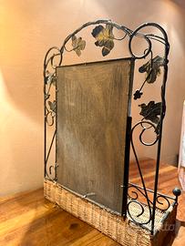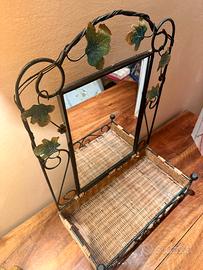 Specchiera da camera o da bagno in ferro battuto con appoggio portacose in legno intrecciato.