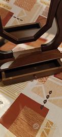 specchiera in legno, ottime condizioni, con cassettino per varie, ottimo per zona trucco o altro, specchio inclinabile, dimensioni lunghezza 41cm, h 50cm profondità 15cm.