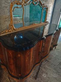 Stupenda specchiera in oro di inizio '900, decorazioni a foglia, legata ad una credenza in legno con rivestimento in vetro. misure L 190 x P 60 x H 165 (90 la sola credenza)