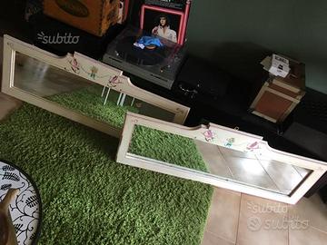 Specchiera in legno massiccio di manifattura artigianale, decori a tempera. Rigorosamente eseguiti a mano, raffigurano dei cigni che reggono dei nastri, ottima manifattura, stile shabby o provenzale.