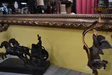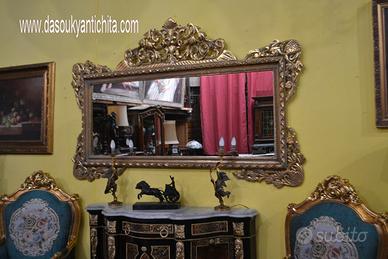 Bellissima ed elegante specchiera stile Barocco, in legno intagliato a mano e dorato in foglia oro.