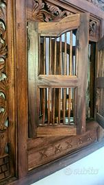 Specchiera finestra in vetro e legno con intarsi in arte tailandese che si abbina sia ad arredamento per interni classici che moderni. Dimensioni: lunghezza 80 cm, altezza 90 cm. Consegna a mano in Torino.