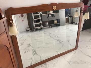 Specchiera da Bagno fatta da artigiano falegname, ideale per doppio lavabo. In Legno massello color Noce fornite di lampade di vetro e bronzo . Dotato di presa elettrica e interruttore on/off. Misure 115 cm alto X 150 cm largo
