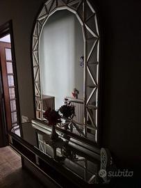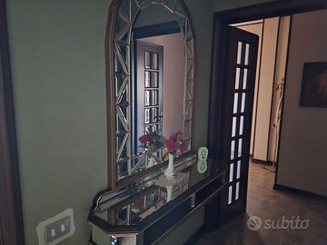 Fantastica specchiera con console in cristallo e bordi in noce stile contemporaneo.