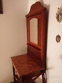 Elegante toeletta d'epoca in legno con specchiera e basein marmo. Il mobile è dotato di due cassetti e a lato il porta asciugamano che è a scomparsa in legno, molto originale ed elegante; al piano sotto altro ripiano in legno decoroso offrendo spazio per riporre oggetti e accessori. La struttura è solida, piano in marmo rosso di ASIAGO