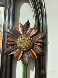 Imponente specchiera monumentale in legno intagliato in stile Liberty floreale, caratterizzata da eleganti linee arcuate e raffinata decorazione a girasoli scolpiti.