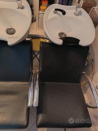 2 poltrone lavatesta complete di rubinetteria,una ha uno strappo alla base della seduta.