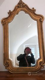 La doratura, in calda tonalità oro antico, presenta una piacevole patina che ne esalta il fascino decorativo. Lo specchio è ben conservato con leggere tracce del tempo che ne attestano autenticità e carattere.