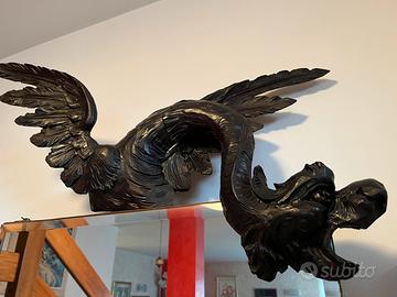 • Dettaglio: Cimasa scultorea con drago alato finemente intagliato.