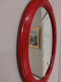 Specchiera ovale in legno laccata color rosso e patinata. Per qualsiasi informazione chiedere tramite chat o tramite telefono.