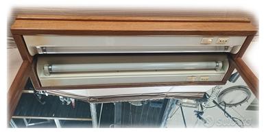 Bella specchiera seminuova in legno per bagno con mensola e testata (cima) con interruttore e lampada al neon e presa 220 v 10 A