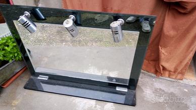Specchiera per bagno con 3 luci sulla parte alta e ripiano in basso. Cornice in vetro di colore verde scuro. Le misure sono 80x60x15 cm