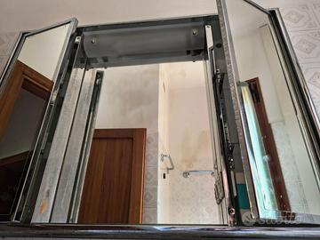 Solida specchiera per bagno anni ' 50.in acciaio ( cromatura un po' rovinata, si veda foto), con 2 sportelli a specchio. SPECCHIO ANCHE ALL' INTERNO degli sportelli, ci si può specchiare da dietro). Totale 5 specchi bellissimi. Tutto in vetro e acciaio. Molto solida. 65 x 100