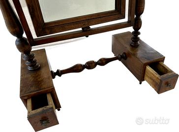 Bellissima Specchiera Psiche da appoggio timpano colonne tornite noce con 2 cassetti e specchio bi-direzionale basculante epoca 800.