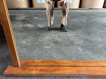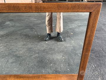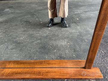 Specchiera rettangolare da appoggio con struttura in legno,anni 80. Non presenta difetti particolari. Dimensioni: Base: 176x 10,5 h 3 cm Specchio con cornice: 162,5x 72 cm