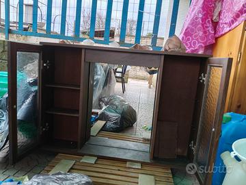 Specchiera per bagno con sportelli laterali, colore legno scuro misure : lunghezza 92 cm, altezza 62 cm, profondità 16 cm.