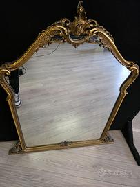 Specchio da parete o da terra con cornice dorata in stile barocco o rococò , la cornice presenta intagli elaborati e forme sinuose con aspetto lussuoso e classico
